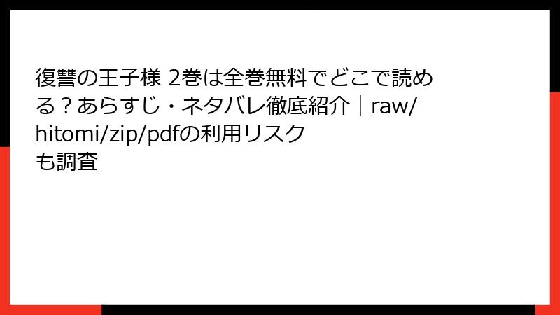 こんにちは、漫画ファンの皆さん!『復讐の王子様』は、転生と復讐をテーマにしたスリリングなストーリーで、多くの読者を魅了しています。しかし、この人気作品をraw、hitomi、zip、pdf、漫画バンクなどの海賊版サイトで読もうと考える方もいるかもしれません。一見「無料」で手軽に見える海賊版サイトですが、そこには重大なリスクが潜んでいます。この記事では、海賊版サイトを利用することの危険性を、法的・技術的・倫理的な観点から詳しく解説します。ブログ形式で、読み応えのある内容をお届けしますので、ぜひ最後までご覧ください!