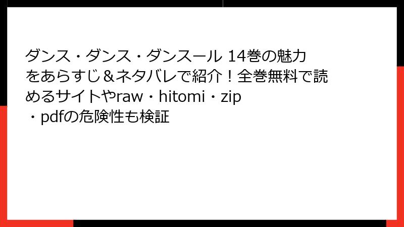 こんにちは、マンガ愛好家の皆さん! ジョージ朝倉先生の傑作『ダンス・ダンス・ダンスール』を熱く語るブログへようこそ。バレエの情熱と青春のドラマが詰まったこの作品、合法的に楽しむのが一番ですが、つい「無料で読みたい!」とraw、hitomi、zip、pdf、漫画バンクなどの海賊版サイトに手を出してしまう方も少なくありません。2025年現在、これらのサイトはドメインを変えながら生き残っていますが、便利さの裏側に深刻なリスクが潜んでいます。この記事では、法的・セキュリティ・経済的・倫理的な側面から、詳しくリスクを解説。読み応えのある内容で、なぜ正規ルートを選ぶべきかを深掘りします。安全第一でマンガライフを満喫しましょう!