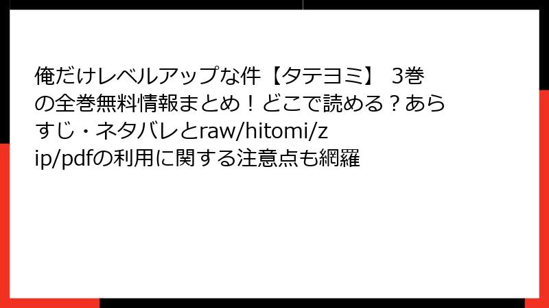こんにちは、漫画愛好家のブロガーです! 今日のテーマは、『俺だけレベルアップな件【タテヨミ】 3巻』のような魅力あふれる作品を、raw、hitomi、zip、pdf、漫画バンクなどの海賊版サイトで読むことのリスク。無料で最新巻にアクセスできるのは魅力的ですが、2025年現在、これらのサイトは法的・セキュリティ・倫理的な落とし穴だらけです。利用者の被害事例が急増しており、軽い好奇心で訪れると取り返しのつかないトラブルに陥る可能性大。この記事では、複数の視点からリスクを深掘りし、なぜ正規ルートを選ぶべきかを読み応えのある内容でお届けします。ネタバレなしで安全な読書を心がけましょう!