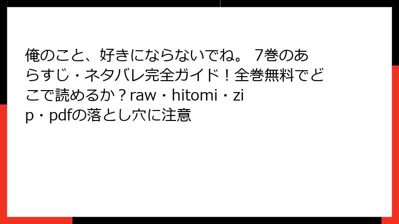 こんにちは、漫画愛好家のあづみです! 人気ラブコメ『俺のこと、好きにならないでね。』の7巻が話題沸騰中ですが、ついつい「無料で読みたい!」と海賊版サイト(raw、hitomi、zip、pdf、漫画バンクなど)に手を出してしまいそうになる気持ち、わかります。でも、待って! そんなサイトは「無料の罠」満載で、アクセスするだけで大惨事になる可能性が。今回は、法的リスクからセキュリティの脅威まで、詳しく解説します。ネタバレじゃなく「現実の恐怖」をネタバレ級に暴露! 正規ルートで楽しむのが一番ですよ。それでは、深掘りしていきましょう。