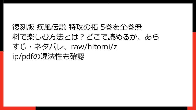 こんにちは、漫画ファン必見のブログへようこそ! ヤンキー漫画の不朽の名作『疾風伝説 特攻の拓』を、raw、hitomi、zip、pdf、漫画バンクなどの海賊版サイトで読もうかと迷っている方、ちょっと待ってください。この記事では、そんな「無料で手軽に読める」誘惑の裏側に潜む深刻なリスクを、徹底的に掘り下げます。復刻版が話題の今こそ、正規ルートで楽しむ重要性を再認識しましょう。法的トラブルからサイバー攻撃まで、具体例を交えながら解説。読み終わったら、海賊版とはおさらばしたくなるはずです!