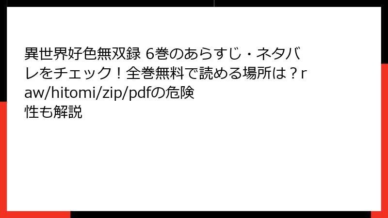 異世界好色無双録 6巻は、エロスとストーリーの融合が最大の魅力。リリアの裏切りやサオの成長、豪華なハーレムパーティは、シリーズファンを熱狂させ、新規読者にも衝撃を与えています。作画の美しさやキャラの魅力は文句なしですが、エロのボリュームに賛否があるのも事実。それでも、「エロ漫画の枠を超えた」との評価が多く、シリーズのターニングポイントとして高い支持を集めています。