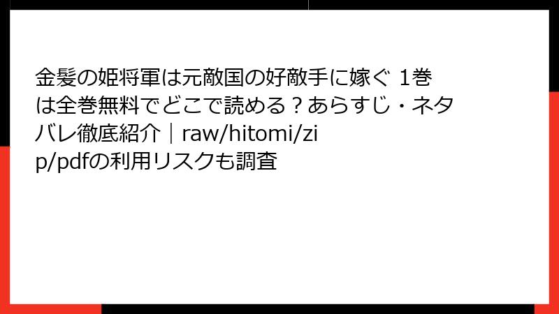 こんにちは、マンガ大好きブロガーのあかりです! 今回は、話題のファンタジーロマンスコミック『金髪の姫将軍は元敵国の好敵手に嫁ぐ』を、raw、hitomi、zip、pdf、漫画バンクなどの海賊版サイトで読むことのリスクについて、詳しく解説します。この作品は、壮大なストーリーと美しいイラストで多くのファンを魅了していますが、無料で読めるからといって海賊版サイトを利用するのは非常に危険。法的問題から個人情報の漏洩、デバイスへのダメージまで、リスクは多岐にわたります。この記事では、その危険性を具体的に掘り下げ、なぜ正規ルートで読むべきかを説明します。さっそく、詳細を見ていきましょう!