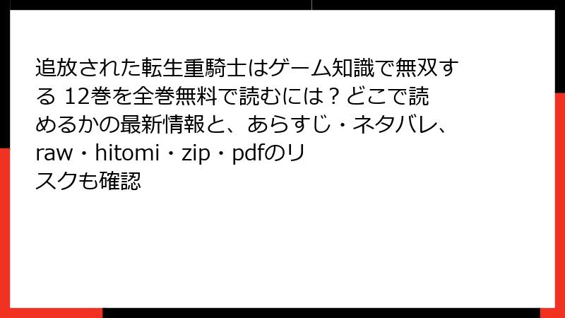 こんにちは、漫画好きのブロガーです! 人気の異世界転生漫画『追放された転生重騎士はゲーム知識で無双する』を無料で読みたい気持ち、わかります。でも、raw、hitomi、zip、pdf、漫画バンクなどの海賊版サイトに手を出そうものなら、思わぬ落とし穴が待っています。この記事では、そんな違法サイトのリスクを、法的・セキュリティ・プライバシー・経済・社会的側面から詳しく掘り下げます。ネタバレじゃなく「本物の被害」を知って、正規ルートで楽しむ賢い読書を心がけましょう! 複数のセクションで読みやすくまとめました。参考にどうぞ。