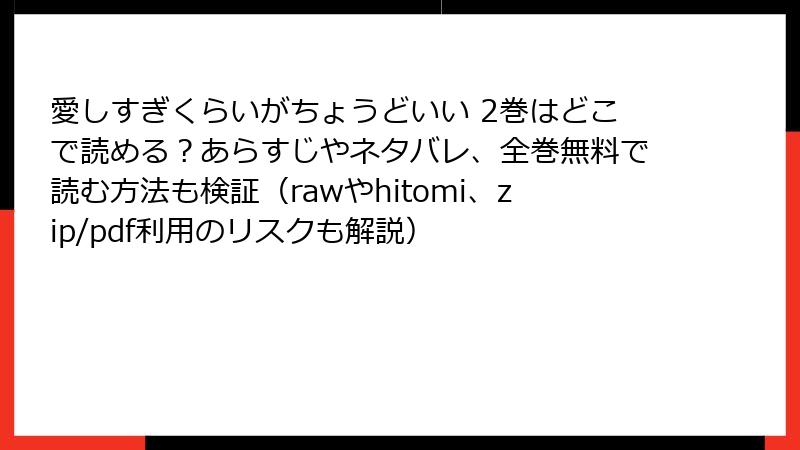 こんにちは、漫画好きのブロガーです! 今日は、誰もが一度は気になったことがある「raw」や「hitomi」、「zip」、「pdf」形式のダウンロードサイト、さらには「漫画バンク」などの海賊版サイトで人気のBL漫画『愛しすぎくらいがちょうどいい』を読むことのリスクを、徹底的に掘り下げてお話しします。無料で手に入る喜びは魅力的ですが、その裏側に潜む危険は想像以上。法的トラブルからデバイス破壊、個人情報漏洩まで、実際の事例を交えながら詳しく解説します。読了後には、正規ルートで楽しむ重要性がきっと実感できるはず。では、早速本題へ。