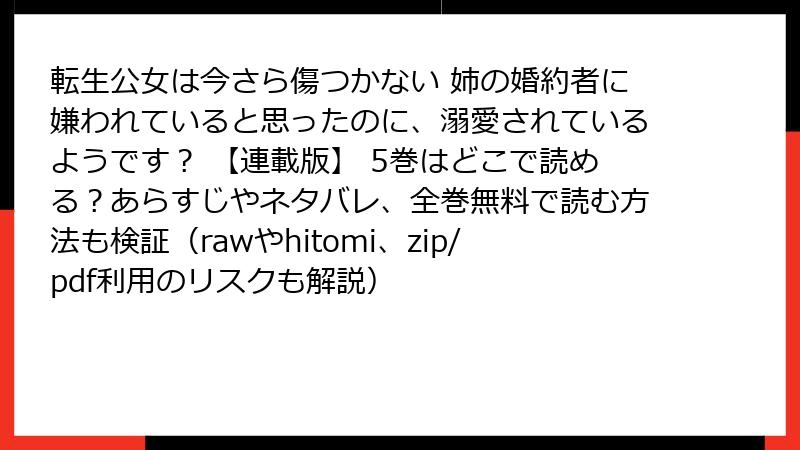 こんにちは、漫画ファンのみなさん! そらほし原作、葉月作画の『転生公女は今さら傷つかない 姉の婚約者に嫌われていると思ったのに、溺愛されているようです? 【連載版】』は、異世界転生ロマンスの傑作として多くの読者を魅了しています。しかし、この人気コミックを「raw」「hitomi」「zip」「pdf」「漫画バンク」などの海賊版サイトで読もうと考える方もいるかもしれません。今回は、こうした海賊版サイトを利用することの重大なリスクを、ブログ記事形式で詳しく解説します。海賊版サイトの利用は、単なる「無料で読める」便利さの裏に、法的な問題から個人情報の危険まで、多くの落とし穴が潜んでいます。さっそく、リスクを項目ごとに掘り下げ、なぜ正規ルートで読むべきかを明らかにしていきましょう!