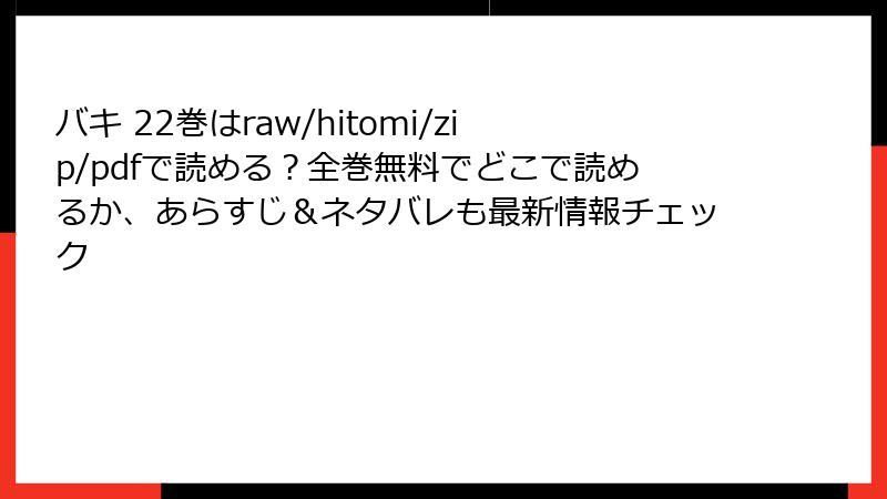 『バキ』22巻の電子書籍版は、挙げた全サービスで配信中。無料試し読みから始め、お得クーポンを活用すれば、定価の半額以下で楽しめます。海賊版のリスクを避け、クリエイター支援の正規ルートを選んで。あなたのおすすめサービスはどれ? 刃牙のように、最高の選択で勝利を掴んでください!