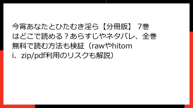 raw/hitomi/zip/pdf/漫画バンクなどの海賊版サイトは、法的・セキュリティ・プライバシー・経済・倫理の多角的リスク満載。一時の快楽が、取り返しのつかない損失を生む可能性大です。2025年の今、無料試し読み豊富な正規電子書籍サービスを選んで、クリエイターを応援しましょう! 杏珠と響平の甘い物語のように、心揺さぶられる作品を、安心して味わってください。皆さんの体験談や代替サービスのおすすめ、コメントでシェアを♪ 次回はおすすめ合法サイト特集でお届けします。安全第一で、漫画ライフを満喫しましょう!
