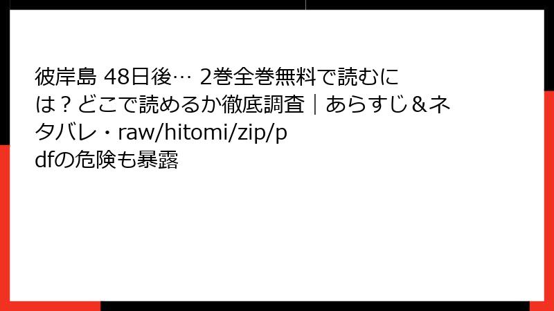 人気ホラーアクション漫画『彼岸島 48日後… 2巻』を、raw、hitomi、zip、pdf、漫画バンクなどの海賊版サイトで読もうとする人は少なくない。無料で手軽にアクセスできる魅力は確かに大きいが、その裏側には深刻なリスクが潜んでいる。ウイルス感染、法的罰則、個人情報漏洩、金銭的損失――これらは単なる「可能性」ではなく、実際に多数の被害者が報告している現実だ。この記事では、そんな海賊版サイトの危険性を多角的に解説する。『彼岸島』の血みどろの戦いを楽しむ前に、ぜひ読み進めてほしい。あなたのデバイスやプライバシーを守るための知識が、ここにある。
