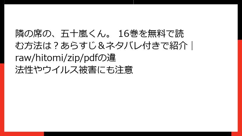 こんにちは、漫画ファンの皆さん! 瞳ちご先生とひなた先生の人気少女漫画『隣の席の、五十嵐くん。』は、椿と五十嵐くんの甘酸っぱい恋物語が魅力の作品です。しかし、無料で読めるからといって、raw、hitomi、zip、pdf、漫画バンクなどの海賊版サイトを利用するのは危険がいっぱい! 今回は、これらの海賊版サイトで漫画を読むことのリスクを、法律、セキュリティ、倫理の観点から詳しく解説します。ブログ形式で、