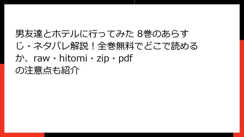 こんにちは、漫画ファンの皆さん! 深海ゆゆ先生の人気作『男友達とホテルに行ってみた』は、ドキドキのストーリーと魅力的なキャラクターで多くの読者を虜にしています。しかし、この素晴らしい作品を、raw、hitomi、zip、pdf、漫画バンクなどの海賊版サイトで読もうと考える人もいるかもしれません。今回は、そんな海賊版サイトを利用することのリスクを徹底解説します。法的問題から個人情報の危険まで、詳しく掘り下げ、読み応えのある内容でお届けします。漫画を愛するなら、正規ルートで楽しむ大切さを一緒に考えましょう!