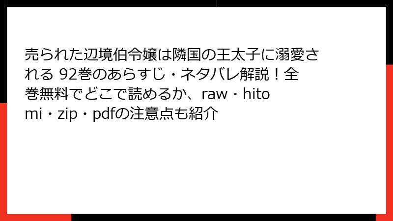 こんにちは、漫画愛好家の皆さん! 今回は、人気コミック『売られた辺境伯令嬢は隣国の王太子に溺愛される』を、raw、hitomi、zip、pdf、漫画バンクなどの海賊版サイトで読むことのリスクについて、詳しく解説します。この作品は、辺境伯令嬢アンナと王太子ルシアンの溺愛ロマンスが魅力のファンタジー漫画ですが、無料で読める海賊版サイトに手を出す前に、知っておくべき重大な危険があります。法的な問題から個人情報の漏洩、さらにはデバイスのセキュリティリスクまで、ブログ記事形式で徹底的に掘り下げます。読み応えのある内容で、皆さんが安全に漫画を楽しむための情報を提供しますので、ぜひ最後までご覧ください!