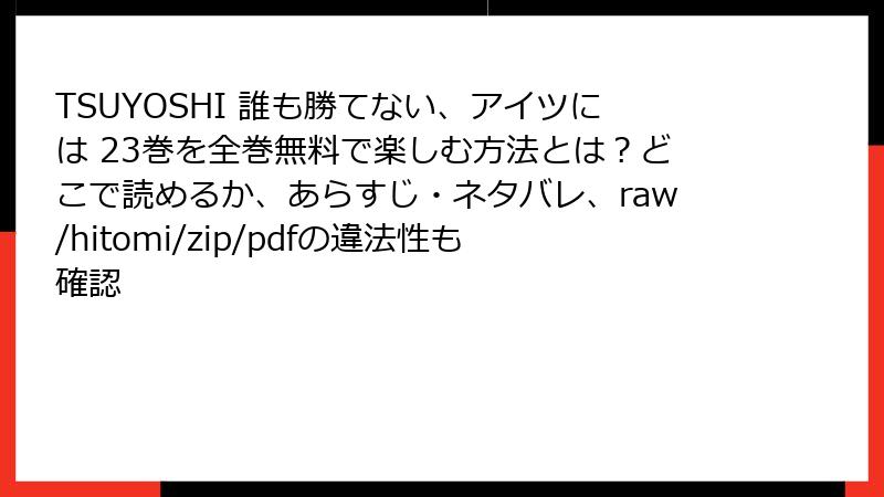 いかがでしたか? 海賊版サイトで『TSUYOSHI 誰も勝てない、アイツには』を読むことは、法的、倫理的、技術的、社会的なリスクを伴う危険な行為です。好きな作品を安全に楽しみ、作者や業界を応援するためにも、正規の購入を心がけましょう。この熱い格闘漫画の続きを、胸を張って楽しむために、今日から正規ルートで読み進めてみませんか? 次回のレビューもお楽しみに!