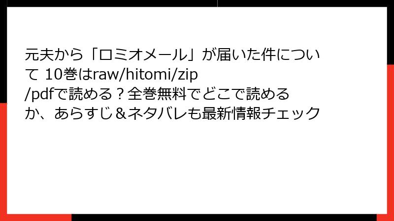 こんにちは、電子書籍ハンターのブロガー、マンガマニアです! 結衣まどか先生の人気作『元夫から「ロミオメール」が届いた件について』は、バツイチ主人公・紗雪が元夫のキモ可愛いメールに振り回されつつ、新恋愛に挑むドロドロ&胸キュン満載の傑作。2025年10月現在、10巻まで配信中で、電子書籍版が気になるところですよね。今回は、コミックシーモア、ブックライブ、まんが王国、ebookjapan、Renta!、めちゃコミック、ピッコマ、LINEマンガなどの主要サービスを徹底調査! どこで読めるのか、無料試し読みの有無やお得ポイントを詳しく解説します。海賊版はリスク満載なので、正規ルートで楽しもう♪
