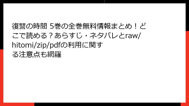 こんにちは、マンガファンの皆さん! 『復讐の時間』のような人気漫画は、ドロドロの復讐劇と緻密なストーリーで多くの読者を魅了しています。しかし、raw、hitomi、zip、pdf、漫画バンクなどの海賊版サイトでこの漫画を読むことは、重大なリスクを伴います。無料で読めるからといって、安易に利用すると、個人情報の漏洩や法的な問題、さらには作者や業界への悪影響など、さまざまな危険が潜んでいるのです。この記事では、『復讐の時間』を海賊版サイトで読むことのリスクを、詳細に解説します。ブログ形式で、わかりやすく、かつ読み応えのある内容でお届けしますので、ぜひ最後までお読みください!