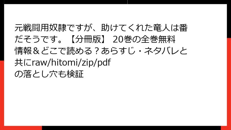 こんにちは、マンガ好きのブロガーです! 今日は、異世界ファンタジー界隈で話題沸騰中の作品『元戦闘用奴隷ですが、助けてくれた竜人は番だそうです。【分冊版】』の20巻について、詳しくあらすじを掘り下げてお届けします。このシリーズは、奴隷の少女と竜人の男性の運命的な出会いから始まる、切なくも心温まるラブストーリー。原作小説の魅力をコミカライズでさらに鮮やかに描き出しています。分冊版ならではの細やかなエピソードが満載で、毎回ドキドキが止まりません! 今回は20巻のストーリーをネタバレありで徹底解説。まだ読んでいない方は、ここでストップをおすすめしますよ。それでは、さっそく本編の世界へ飛び込みましょう。