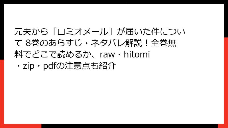 こんにちは、漫画愛好家のブロガー、コミックハンターです! 今日は、皆さんが気になりがちなトピックに切り込みます。人気のラブストーリー漫画『元夫から「ロミオメール」が届いた件について』のような作品を、raw、hitomi、zip、pdf、漫画バンクなどの海賊版サイトで読むことのリスクを、詳しく深掘りします。一見、無料で手軽にアクセスできる魅力がありますが、2025年現在、これらのサイトは法的・セキュリティの落とし穴だらけ。実際の被害事例も急増中です。この記事では、ブログ風に読みやすくまとめ、リスクを多角的に解説。読了後には、正規ルートの重要性がきっと実感できるはず! それでは、早速本題へ。
