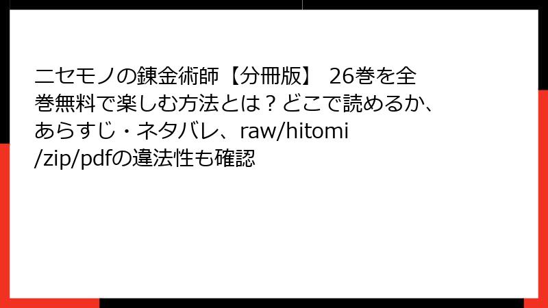 こんにちは、漫画愛好家の皆さん! ブログ「マンガ深掘りラボ」へようこそ。今日は、ちょっとデリケートだけど超重要なトピックをお届けします。人気のダークファンタジー漫画『ニセモノの錬金術師【分冊版】』のような作品を、raw、hitomi、zip、pdf、漫画バンクなどの海賊版サイトで読むことのリスクについて、ガッツリ詳しく解説します。無料で最新巻が手に入るのは魅力的ですが、2025年現在、これらのサイトは法的・セキュリティの地雷原。軽い気持ちでアクセスすると、後悔の連続ですよ。ネタバレなしでリスクだけに絞って、読み応え満点でお伝えします。未読の皆さん、参考にどうぞ!