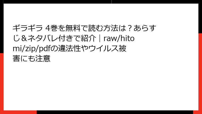 『ギラギラ』をraw、hitomi、漫画バンクなどの海賊版サイトで読むことは、法的トラブル、デバイスや個人情報の危険、クリエイターへの損害、品質低下といった多くのリスクを伴います。一時の無料アクセスを求めて、大きな代償を払うのは賢明ではありません。公式の電子書籍や単行本を選べば、安全かつ高品質な読書体験が得られ、滝直毅氏や講談社の努力を支えることができます。『ギラギラ』のギラギラした世界を、正当な形で楽しむことで、物語の熱さと感動を最大限に味わいましょう。ファンとして、漫画業界の未来を守る一歩を踏み出してください!