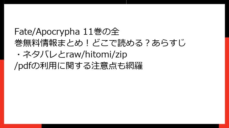 こんにちは、漫画とFateシリーズを愛するブログ管理人です。『Fate/Apocrypha』第11巻は、聖杯大戦の激しい展開と魅力的なキャラクタードラマでファン必読の一冊ですが、残念ながら、raw、hitomi、zip、pdf、漫画バンクなどの海賊版サイトで無料で読もうとする人が後を絶ちません。これらのサイトを利用することは、一見お得に思えるかもしれませんが、実は多くのリスクを伴います。この記事では、海賊版サイトで『Fate/Apocrypha』を読むことの危険性を、法的、倫理的、技術的な観点から詳しく解説します。読み終わる頃には、正規版を購入する価値を再認識できるはずです!