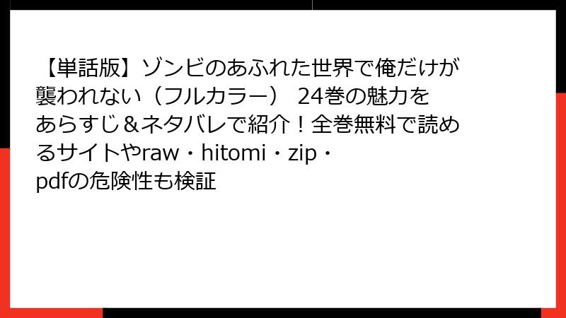 こんにちは、漫画好きの皆さん! 今日は、ゾンビアポカリプスを舞台にしたエロティックでスリリングなフルカラーコミック、『ゾンビのあふれた世界で俺だけが襲われない』の単話版24巻について詳しくお話しします。この作品は、原作の裏地ろくろ先生の小説を基に、増田ちひろ先生の魅力的な作画で描かれる人気シリーズ。主人公の武村がゾンビに襲われないという謎の能力を活かし、過酷な世界でサバイバルする姿が描かれますが、24巻では特に人間同士の暗い欲望と勇気の対決が熱い! ネタバレを交えつつ、読み応え満点のあらすじを展開していきます。ゾンビの恐怖だけでなく、心理描写の深さが光る一冊ですよ。