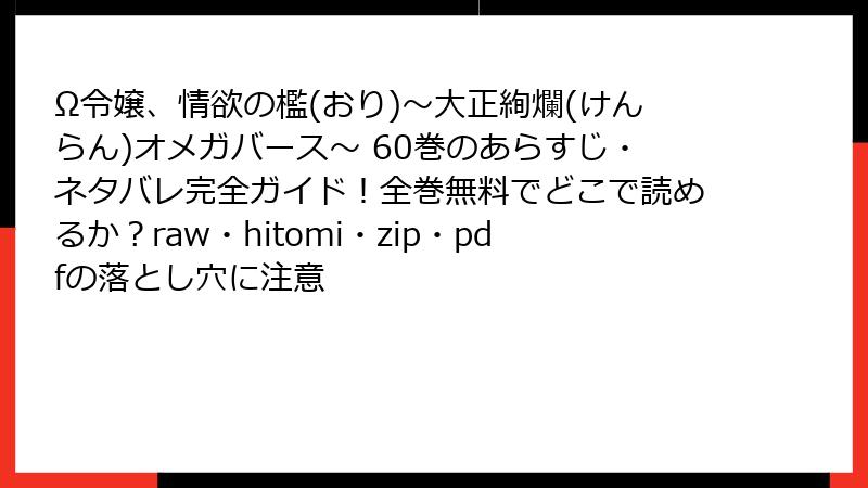 こんにちは、マンガマニアのあかりです! 今回は、菫野さとみ先生の『Ω令嬢、情欲の檻~大正絢爛オメガバース~』60巻のネタバレを徹底的に掘り下げます! 大正時代の華やかな財閥社会を舞台に、α・β・Ωの第二性別が織りなす愛憎劇が炸裂するこのシリーズ。60巻では、物語が新たな頂点に達し、衝撃の事実が次々と明らかに! ネタバレ全開なので、未読の方はご注意ください。以下、