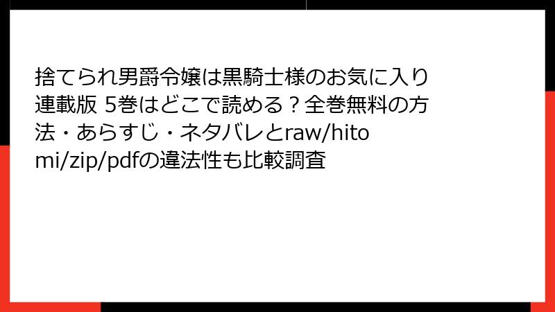 こんにちは、漫画大好きだけど安全第一派のみゆきです! 前回まで『捨てられ男爵令嬢は黒騎士様のお気に入り 連載版 5巻』の魅力に語りまくりましたが、今日は真面目モードで、raw、hitomi、zip、pdf、漫画バンクなどの海賊版サイトでこの漫画(や他の作品)を読むリスクについて詳しくお話しします。無料で読めるのは魅力的だけど、実はそれ以上の損失を招く可能性が…。この記事では、法的・セキュリティ・経済的な側面を深掘りし、なぜ絶対に避けるべきかを読み応え満点でお届け。データや事例を基に、複数のセクションで解説します。皆さんの大切なデバイスと時間を守るために、ぜひ最後まで読んでくださいね!