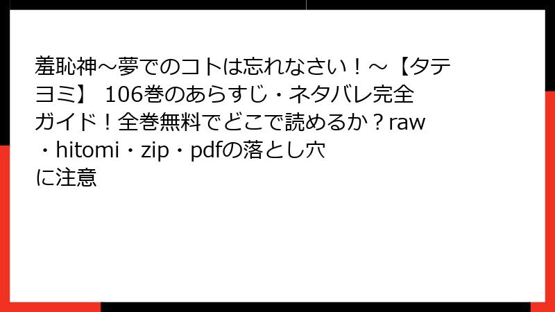 こんにちは、漫画ファンの皆さん! 唯一先生の人気ラブコメ『羞恥神~夢でのコトは忘れなさい!~【タテヨミ】』の第106巻が、2025年10月時点で話題沸騰中! 夢と現実の狭間で繰り広げられる恥ずかしい試練と恋のドキドキが魅力の本作ですが、読者の反応はどうなのでしょうか? 今回は、106巻のレビュー、口コミ、評判をSNSやレビューサイトの声を基に詳しく掘り下げ、ブログ形式でお届けします。タテヨミ形式のダイナミックな魅力とともに、ファンの生の声をお楽しみください!
