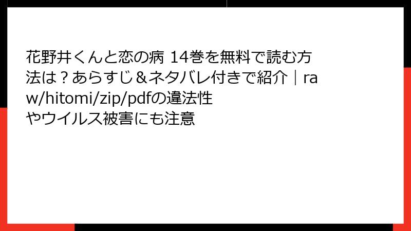 『花野井くんと恋の病』14巻は、ほたると花野井くんの切ない恋物語が炸裂する一冊。こんな素晴らしい作品を、海賊版サイトのリスクにさらして読むのはもったいない! 法的なトラブル、ウイルス感染、業界へのダメージ、低品質な体験…これらのリスクを冒すよりも、正規ルートで作品を愛することで、作者やキャラクターたちへの敬意を表現できます。