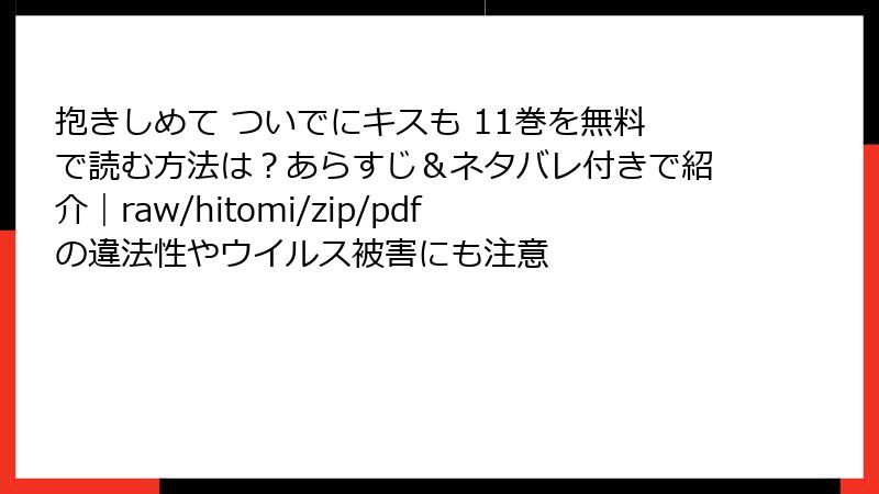 こんにちは、漫画大好きブロガーのあかりです! 『抱きしめて ついでにキスも』は、美森青先生の描く胸キュンラブコメの名作で、11巻の展開にハマっている人も多いですよね。でも、無料で読みたいからと、raw、hitomi、zip、pdf、漫画バンクなどの海賊版サイトに手を出すのは超危険! 今回は、これらの海賊版サイトを利用するリスクを、法律、セキュリティ、倫理の観点から詳しく解説します。安全に漫画を楽しむための知識を、しっかりチェックしてくださいね!