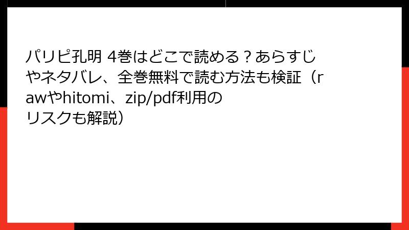 こんにちは、漫画愛好家の皆さん! 人気の『パリピ孔明』のような熱い作品を、無料で手軽に読みたい気持ちはよくわかります。でも、raw、hitomi、zip、pdf、漫画バンクなどの海賊版サイトに手を出すのは、決して賢い選択ではありません。2025年現在、これらのサイトはウイルス感染や法的罰則、個人情報漏洩の温床となっており、利用者の被害報告が急増中です。このブログ記事では、そんな海賊版サイトの具体的なリスクを、セキュリティ、法律、倫理の観点から詳しく解説。事例やデータを交えつつ、読み応え満点でお届けします。あなたのデバイスと心の平穏を守るために、ぜひ最後までお読みください。海賊版の誘惑に負けず、正規ルートで楽しむ未来を一緒に考えましょう!