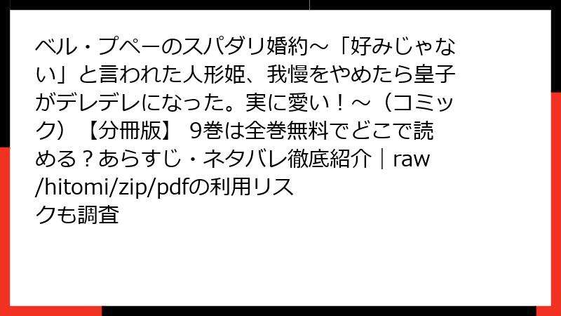 こんにちは、漫画ファンのみなさん! 今回は、朝霧あさき先生原作、セレンさん作画の大人気ファンタジーロマンス『ベル・プペーのスパダリ婚約~「好みじゃない」と言われた人形姫、我慢をやめたら皇子がデレデレになった。実に愛い!~(コミック)【分冊版】』の9巻について、ネット上のレビューや口コミ、評判を深掘りします。この巻は、レティシアとジルベールの関係がさらに深まり、アクションとロマンスが絶妙に絡み合う神巻! ファンの熱い声を中心に、