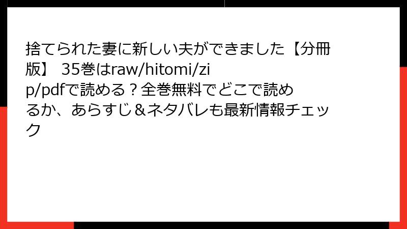 『捨てられた妻に新しい夫ができました【分冊版】』35巻は、物語のターニングポイントとして見逃せない一冊。ロマンス、サスペンス、成長物語の全てが詰まったこの巻を、ぜひ手に取ってみてください。ネタバレを堪能したあなた、次は36巻で一緒にドキドキしましょう!