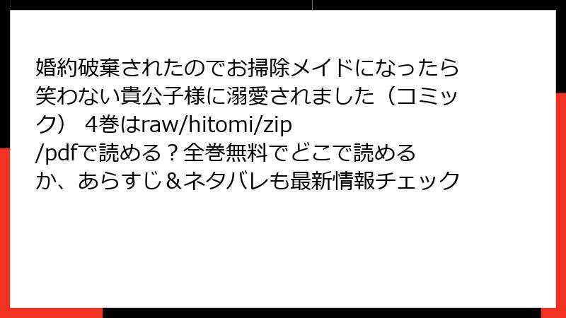 こんにちは、漫画を心から愛するブログ管理人です! 今回取り上げるのは、大人気コミック『婚約破棄されたのでお掃除メイドになったら笑わない貴公子様に溺愛されました』の4巻。このファンタジーロマンスの傑作を、つい無料で読みたいと思う気持ち、わかります。でも、raw、hitomi、zip、pdf、漫画バンクなどの海賊版サイトで読むのは、実は大きなリスクが潜んでいます。この記事では、海賊版サイトを利用することの危険性を、法律・セキュリティ・倫理の観点から詳しく解説します。読み応えのある内容にするため、