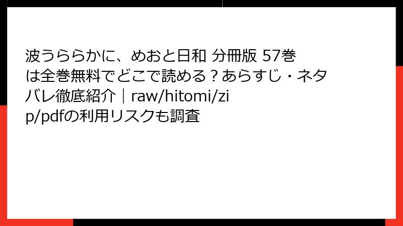 こんにちは、漫画を愛するブロガーのまんがうららです! 『波うららかに、めおと日和』は、昭和の夫婦愛を丁寧に描いた西香はち先生の名作で、2025年のドラマ化でさらに注目を集めています。しかし、この素晴らしい作品を「raw」「hitomi」「zip」「pdf」「漫画バンク」といった海賊版サイトで読もうと考える人もいるかもしれません。今回は、そんな海賊版サイトを利用するリスクを徹底的に解説します。無料で読める誘惑に負ける前に、知っておくべき危険性をブログ記事形式で詳しくお伝えします。読み応えのある内容で、皆さんの漫画ライフを守るお手伝いができれば幸いです!