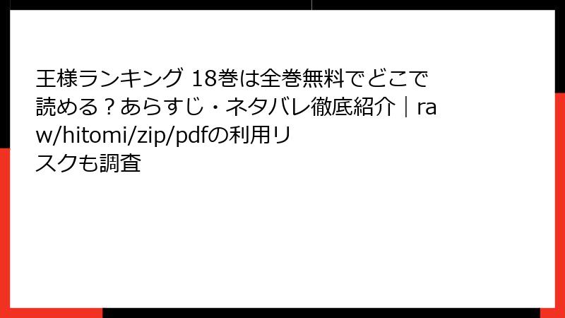 大人気漫画『王様ランキング』を無料で読みたい一心で、海賊版サイトに手を出したことはありませんか? raw、hitomi、zip、pdf、漫画バンクなどのサイトは、一見魅力的に見えますが、実際には法的な罰則からサイバー脅威まで、数えきれないほどのリスクが潜んでいます。作者の十日草輔氏をはじめ、クリエイターの努力を無駄にし、業界全体に深刻な被害を与えるだけでなく、あなた自身のデバイスや個人情報も危険にさらされます。本記事では、これらのリスクを複数の観点から詳しく解説。ブログ風に読みやすくまとめ、箇条書きやテーブルで視覚的に整理します。合法的な楽しみ方を推奨しつつ、なぜ海賊版が「安物買いの銭失い」なのかを徹底解剖!