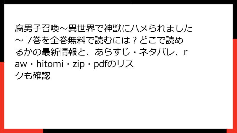 こんにちは、BL漫画を愛する腐女子ブロガーです! 藤咲もえ先生の人気作『腐男子召喚~異世界で神獣にハメられました~』の最新巻が待ち遠しいですよね。異世界ファンタジーとエロティックな神獣溺愛ストーリーが最高に萌えるこの作品、つい無料で読みたい衝動に駆られます。でも、raw、hitomi、zip、pdf、漫画バンクなどの海賊版サイトに手を出したら大惨事! 2025年現在、法的罰則からウイルス感染、個人情報漏洩まで、深刻なリスクが山積みです。このブログ記事では、そんな海賊版の闇を徹底的に掘り下げます。読み応え満点で、事例や比較表も交えながら解説。無料の誘惑に負けず、安全に楽しむための参考にしてくださいね。ネタバレなしで進めますが、絶対に正規ルートをおすすめします!