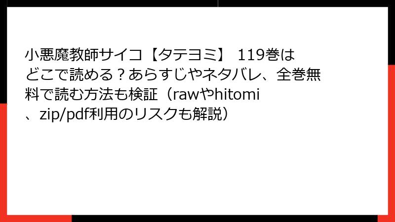 『小悪魔教師サイコ【タテヨミ】』は、指定サービスのほとんどで配信され、無料試し読みが充実した神作。コミックシーモアのボリューム、まんが王国の還元率、LINEマンガの気軽さが特におすすめです。119巻のクライマックスで、心春の過去が明らかになる衝撃を正規ルートで味わってください。あなたはどのサービスから攻めますか? コメントで教えてね! 次回は120巻の予想記事かも? 合法的に、サイコな世界を楽しもう!