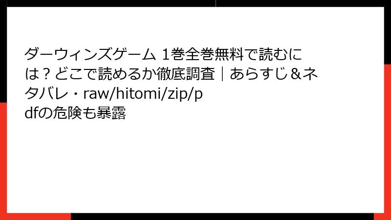 こんにちは、漫画ファンの皆さん! 前回のネタバレ記事に続き、今回はちょっとシリアスなトピック。人気作『ダーウィンズゲーム』をraw、hitomi、zip、pdf、漫画バンクなどの海賊版サイトで読もうとするリスクについて、徹底的に掘り下げます。この作品のスリリングなバトルシーンを無料で楽しみたい気持ち、わかります。でも、その一瞬の快楽が、想像以上の大惨事につながる可能性を甘く見てはいけません。法的トラブルからウイルス感染、個人情報漏洩まで、実際の被害事例を基に詳しく解説。ブログ形式で読みやすくまとめましたので、参考にどうぞ。結論から言うと、絶対に避けましょう! 正規ルートで楽しむのが一番です。それでは、深く潜ってみましょう。