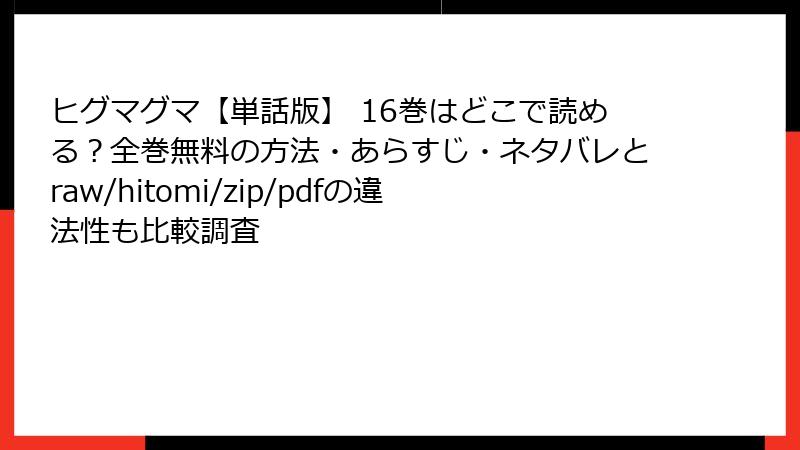 こんにちは、漫画ファン必見のブログへようこそ! 今日は、誰もが一度は気になってしまう「無料で全巻読める!」という誘惑の裏側に潜む闇について、深く掘り下げます。奥谷通教先生の『ヒグマグマ【単話版】』のような魅力的な作品を、海賊版サイト(raw、hitomi、zip、pdf、漫画バンクなど)で読むことのリスクを、2025年現在の最新情報に基づいて詳しくお伝えします。これらのサイトは一見便利に見えますが、法的・セキュリティ・プライバシーの観点から深刻な落とし穴が満載。無料の代償が大きすぎるんです! 読み進めるうちに、「やっぱり正規ルートで楽しもう」と思えるはず。さあ、警鐘を鳴らしていきましょう。