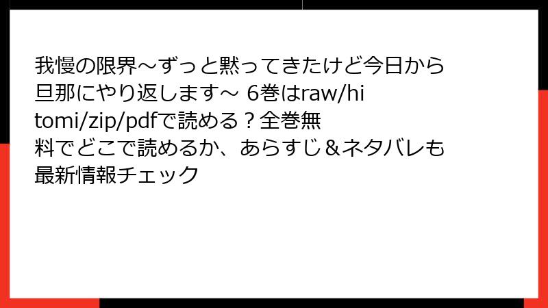 こんにちは、マンガレビューを愛するブロガーです! 青梨先生の「我慢の限界~ずっと黙ってきたけど今日から旦那にやり返します~」は、モラハラ夫への反撃を描くスカッと系コミックとして、多くの読者を魅了しています。特に6巻は、義母との対決や恋の予感など、物語が大きく動くターニングポイント! 今回は、6巻のレビューや読者の口コミ、評判を深掘りし、なぜこの巻が話題なのかをブログ形式で紐解きます。SNSやレビューサイトから集めたリアルな声を中心に、ネタバレ控えめで解説しますので、未読の方も安心してどうぞ!