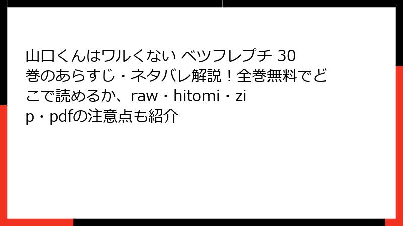 海賊版サイトの魅力は一時的ですが、リスクは一生モノ。法的罰金、ウイルス被害、クリエイターの苦しみ…これらを思うと、正規ルート一択です。『山口くんはワルくない ベツフレプチ』の甘酸っぱい恋を、安心して堪能するために、今日から公式サービスをチェック! あなたの一歩が、マンガ業界の未来を明るくします。質問があればコメントでどうぞ。次回は31巻レビューでお会いしましょう♪