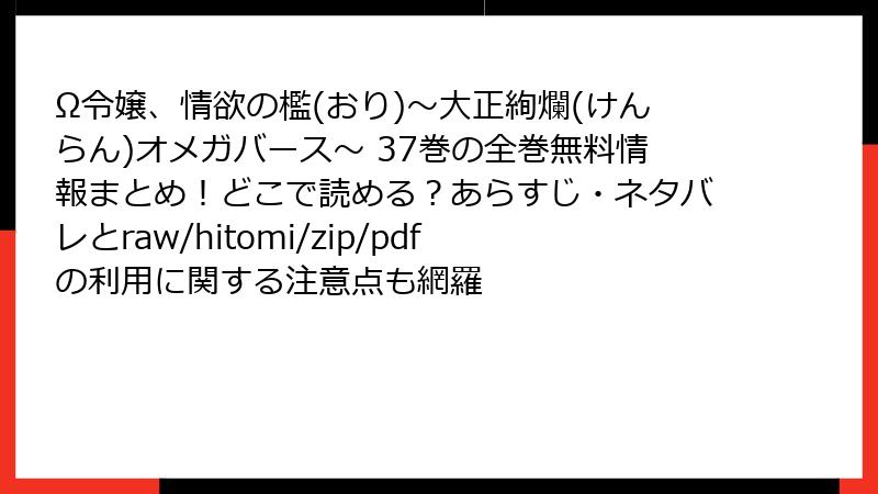 「Ω令嬢、情欲の檻~大正絢爛オメガバース~」は、大正時代を彷彿とさせる絢爛な世界観とオメガバースの独特な設定で、熱烈なファンを獲得している漫画です。37巻では、主人公・葵と貴臣を中心としたドラマチックな展開が話題を呼び、読者の間でさまざまな反応が見られます。この記事では、37巻のレビュー、口コミ、評判を詳しく掘り下げ、ファンの声や作品の魅力をブログ形式で紹介します。以下、複数の視点からその評価を解説します。