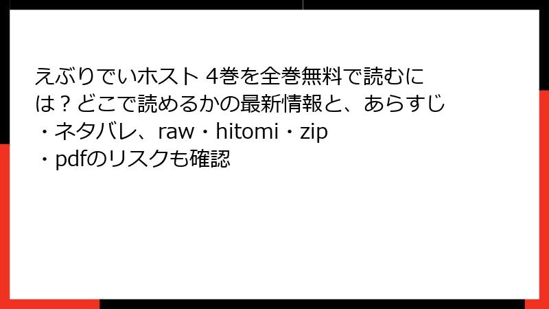 こんにちは、漫画ファン歴20年の「合法読書推進ブロガー」です。『えぶりでいホスト』4巻の熱いネタバレ解説に続き、今回は超重要なお知らせ。raw、hitomi、漫画バンク、zip、pdfなどの海賊版サイトで読むと、実はとんでもないリスクが潜んでいます。