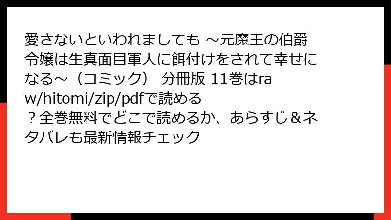 こんにちは、マンガ愛好家のブロガーです! 今回は、双葉社モンスターコミックスfの人気作『愛さないといわれましても ~元魔王の伯爵令嬢は生真面目軍人に餌付けをされて幸せになる~』分冊版11巻のレビュー、口コミ、評判を深掘りします。この作品は、豆田麦さんの原作小説を石野人衣さんがコミカライズした、ファンタジーとラブコメが絶妙に融合した一作。元魔王の伯爵令嬢アビゲイルと生真面目な軍人ルシアンの「餌付け」夫婦生活が、読者の心を掴んで離しません。11巻は物語の約20話前後(推定)を収録し、宮廷の陰謀と甘い日常が交錯する展開が魅力。今回は、読者の声や評価を基に、作品の魅力と反響をブログ形式で詳しくお届けします。