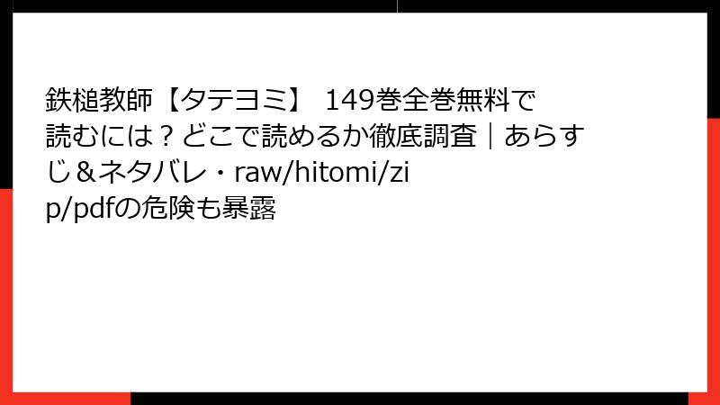 raw/hitomi/zip/pdf/漫画バンクなどの海賊版サイトは、法的罰則、セキュリティ脅威、健康・経済・倫理的ダメージの五重苦。2025年の今、無料の誘惑に負けず、正規電子書籍サービスを選びましょう! LINEマンガやピッコマ、BookLiveなどで『鉄槌教師【タテヨミ】』は安全に読め、初回無料や割引も充実。作者を応援し、業界を支えるのが真のファン。もし被害に遭ったら、すぐにセキュリティソフトでスキャン&警察相談を。