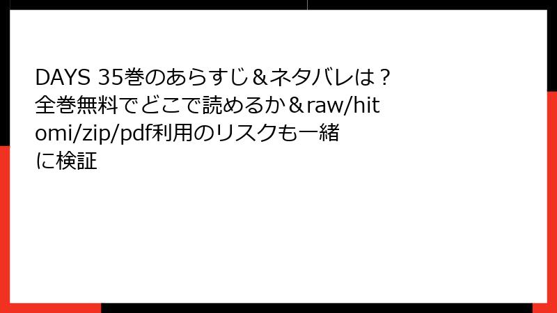 rawや漫画バンクなどの海賊版サイトは、短期的な「無料」の誘惑に満ちていますが、法的罰金、ウイルス感染、倫理的後悔、経済的損失のリスクが大きすぎます。『DAYS』のような名作を、心から楽しむなら、正規の電子書籍サービスや図書館を活用を。クリエイターを応援し、自分を守る選択が、真のファンへの第一歩です。あなたは、今日からどうしますか? コメントでシェアしてください!