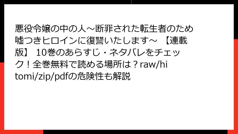こんにちは、マンガファンの皆さん! 人気の悪役令嬢転生もの『悪役令嬢の中の人~断罪された転生者のため嘘つきヒロインに復讐いたします~ 【連載版】』の10巻が話題沸騰中ですが、せっかくの名作を海賊版サイトで読もうと考える方もいるかもしれません。でも、待ってください! raw、hitomi、zip、漫画バンクなどの違法サイトは、無料の誘惑の裏に深刻なリスクが潜んでいます。この記事では、そんな海賊版サイトの具体的な危険性を、法的・セキュリティ・倫理的な観点から詳しく掘り下げます。未読の皆さんはネタバレなしで正規ルートをおすすめしますよ。では、早速本題へ。