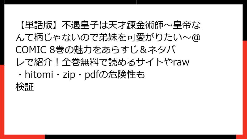 こんにちは、漫画安全読書推進ブロガーの皆さん! 人気のブラザーズファンタジー「不遇皇子は天才錬金術師~皇帝なんて柄じゃないので弟妹を可愛がりたい~@COMIC」の単話版8巻にハマっている方、多いですよね。ほのぼのとした家族愛と錬金術のワクワクがたまらない一冊ですが、最新エピソードを「無料で今すぐ」読みたい一心で、raw、hitomi、zip、pdf、漫画バンクなどの海賊版サイトに手を出していませんか? 2025年現在、これらのサイトは一見便利に見えますが、法的罰則、ウイルス感染、個人情報漏洩など、想像以上のリスクが潜んでいます。実際の被害事例が急増中で、軽い気持ちでアクセスすると取り返しのつかない事態に…。このブログ記事では、そんな海賊版サイトの危険性を多角的に深掘り。複数のセクションに分けて、読み応えのある内容でお届けします。結論から言うと、絶対に避けて正規ルートを選びましょう! 作者のうめー先生や長先ザワ先生の努力を尊重し、安全に楽しむのがファンとして正解です。