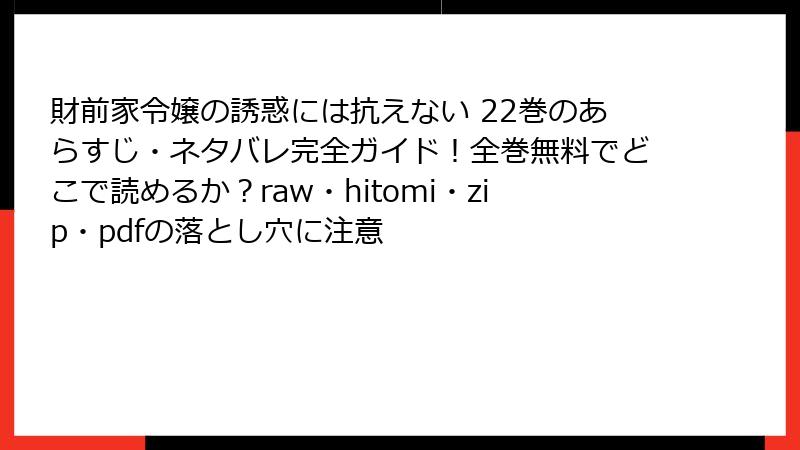 こんにちは、マンガファンの皆さん! 『財前家令嬢の誘惑には抗えない』は、Frate原作・SUNGMIN作画による大人気のエロティック・ロマンス漫画で、魅力的なキャラクターと刺激的なストーリーが話題ですよね。しかし、この作品を「raw」「hitomi」「zip」「pdf」「漫画バンク」などの海賊版サイトで読もうと考えている方、ちょっと待ってください! 海賊版サイトを利用することは、さまざまなリスクを伴う危険な行為です。今回は、ブログ記事形式で、海賊版サイトで『財前家令嬢の誘惑には抗えない』を読むことの具体的なリスクを詳しく解説します。法的、技術的、倫理的な観点から、読み応えのある内容でお届けしますので、ぜひ最後までご覧ください!